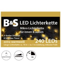 • Material: Kupfer• Farbe: silber metallic• Schalter• Batteriebetrieb: 3x AA, 1,5V (nicht enthalten)• Schutzart: IP20• Länge in cm: 520 • Leuchtmittel: 50x LED