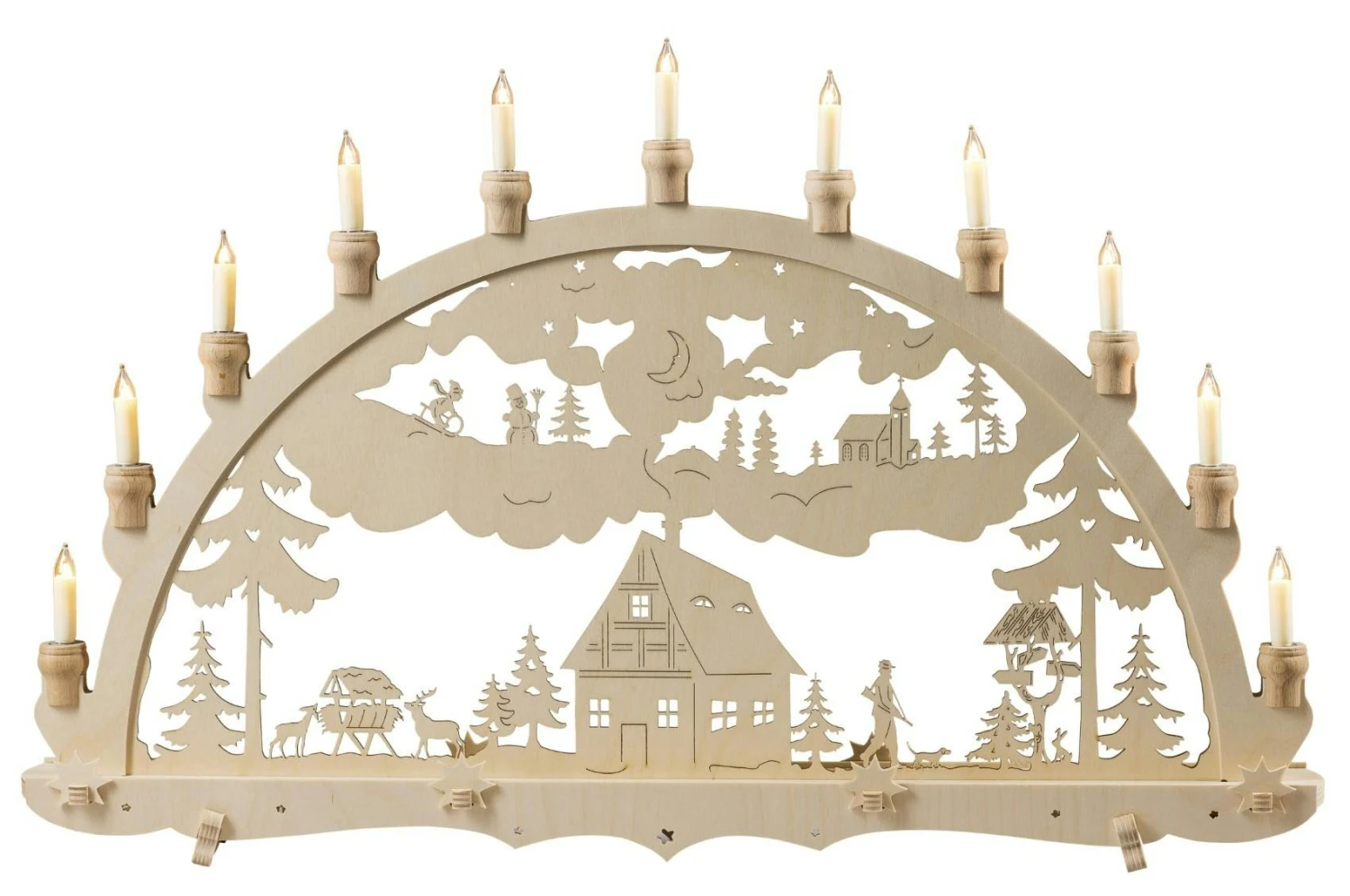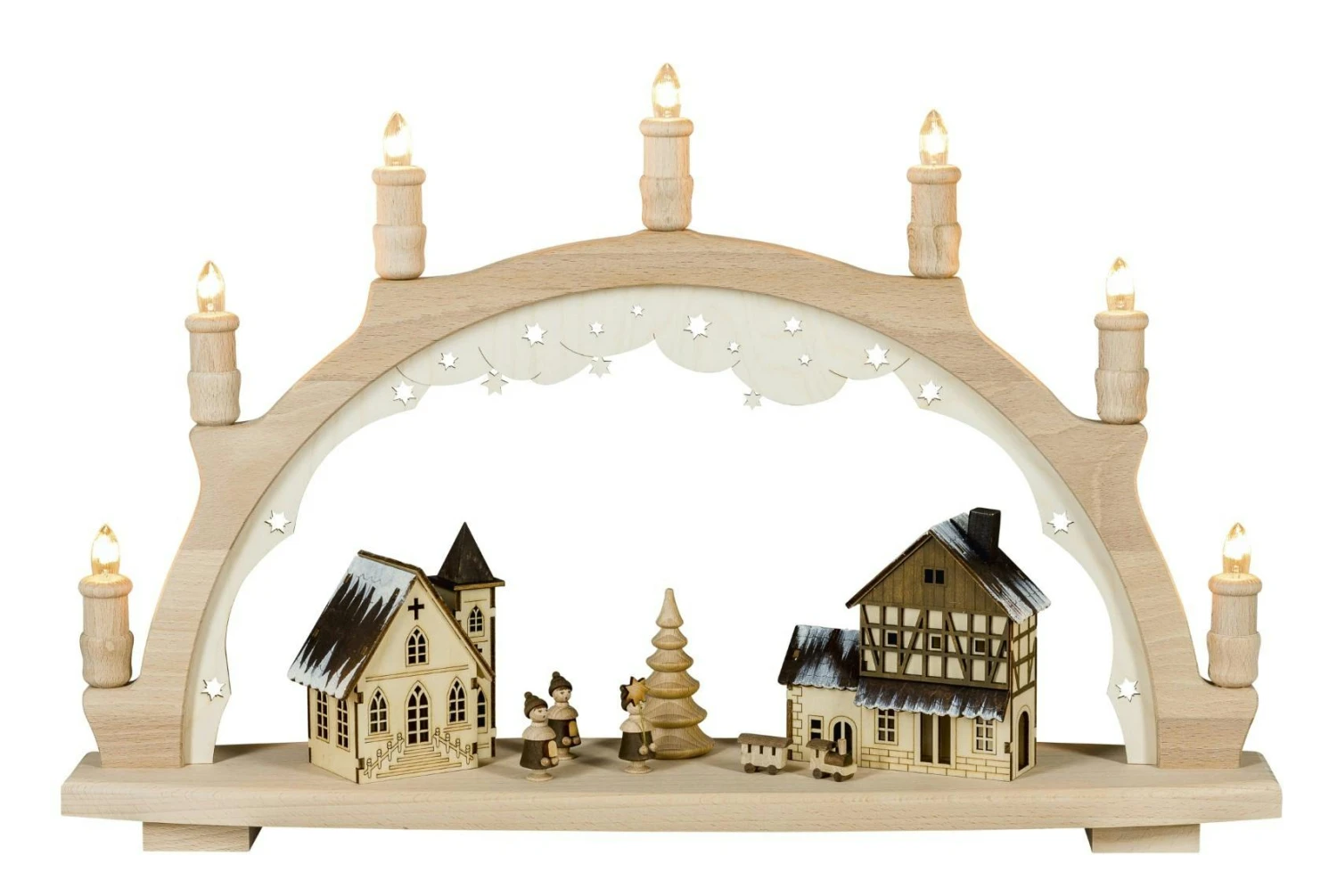 Eine stimmungsvolle Lichterdekoration mit 7 warmweißen Lichtern. Ideal zur weihnachtlichen Tischdekoration und Fensterbankdekoration. Der Lichterbogen wird klassisch über den 230V Stromanschluss mit Energie versorgt. Der weiße Kunststoffkorpus ist pflegeleicht und standfest verarbeitet. Im Lieferumfang ist eine Ersatzlampe enthalten.