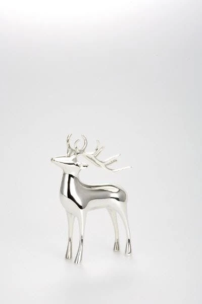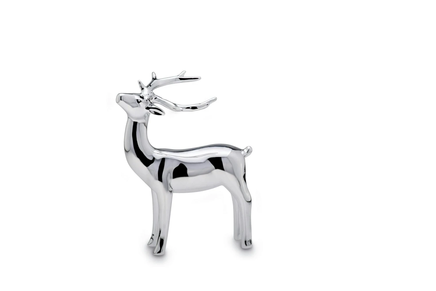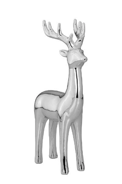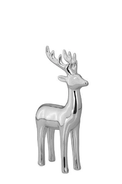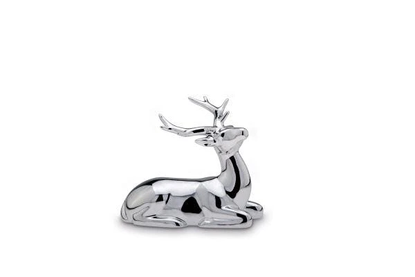 Großes, liegendes Rentier aus Porzellan galvanisiert und silberglänzend. Die Größe ist 15 x 8,8 x 11 cm.