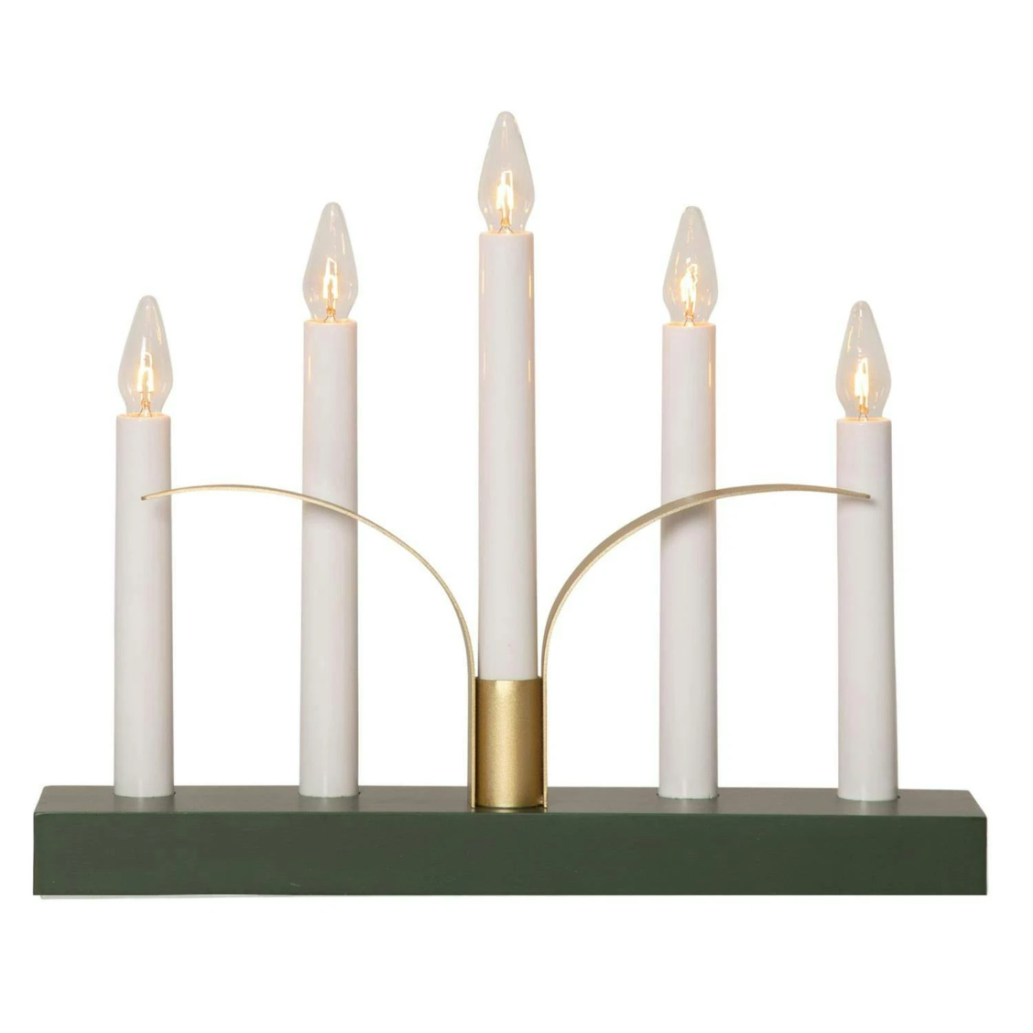 Der wunderschöne grüne Fensterleuchter ist ein absolutes Highlight in Deiner Wohnung als Dekoration von Fensterbänken, Tischen, Beistelltischen oder Kommoden. Der Stimmungsleuchter mit den fünf klaren E10 Glühlampen und der messingfarbenen Verzierung verbreitet eine gemütliche Stimmung. Perfekt zur Weihnachtszeit!