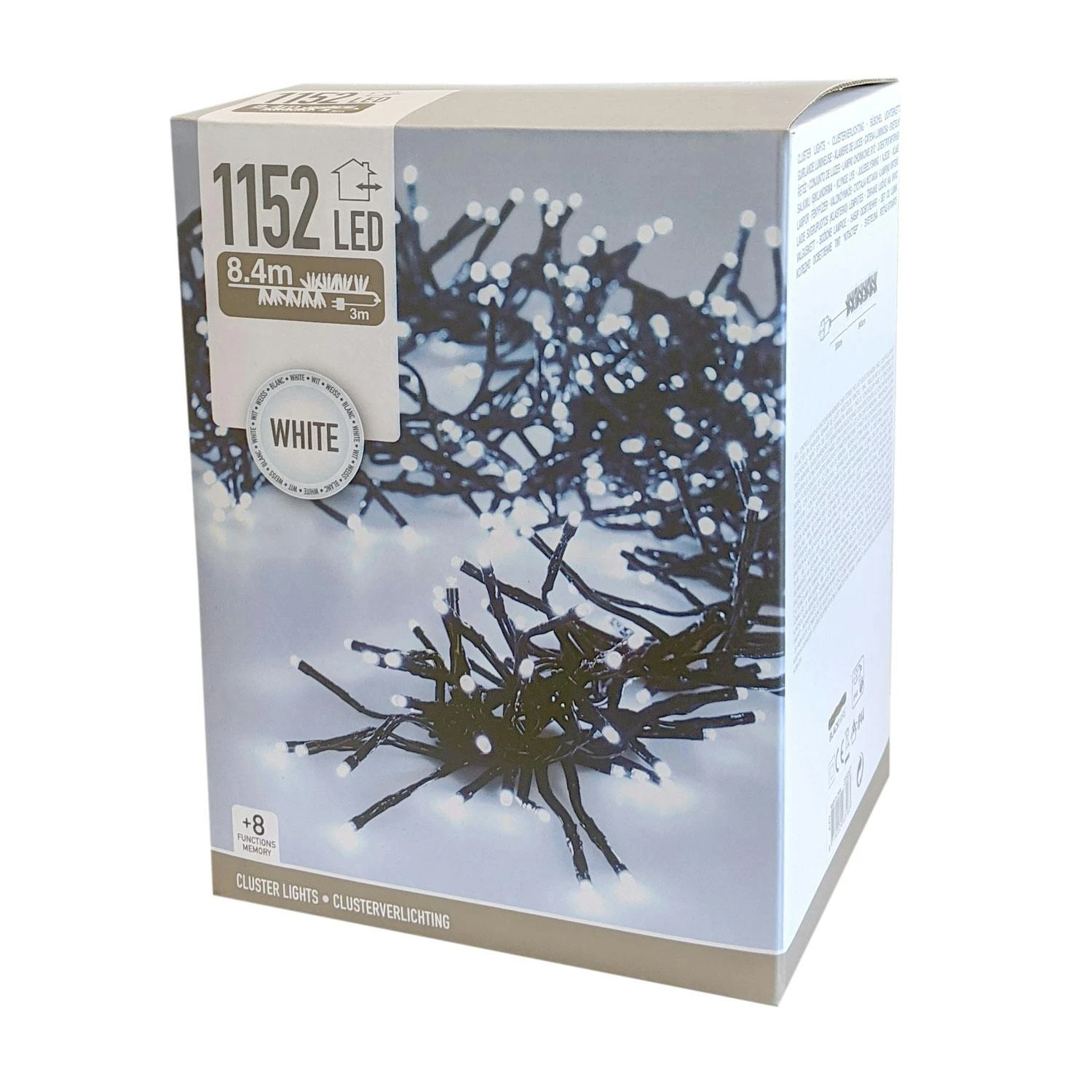 Diese Cluster-Lichterkette, mit kaltweißen LED Lichter, eignet sich hervorragend als Lichterdeko für den Innen- & Aussenbereich. Die verwendete LED-Technik ist gewohnt effizient und hält den Energieverbrauch mit nur 7,2 Watt extrem gering. Die Büschel-Lichterkette enthält 1152 kaltweiße LED-Lichter. Durch einen Taster am Netzteil sind 8 verschiedene Lichteffekte wählbar (comb, in waves, sequential, slo-glo, chasing / flash, slow fade, twinkle / flash, steady on). Der Lichterstrang ist 8,4m lang und die Länge der Zuleitung beträgt 3m.
