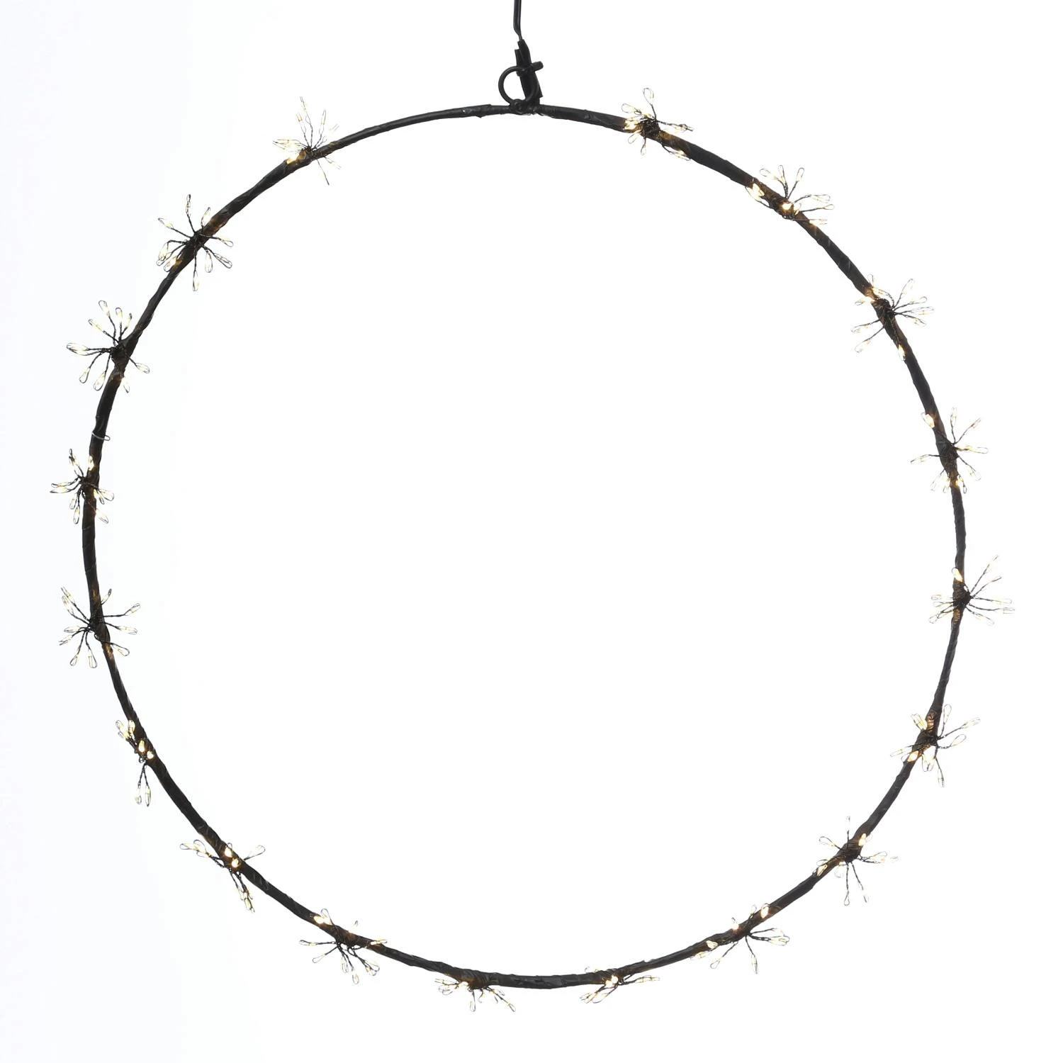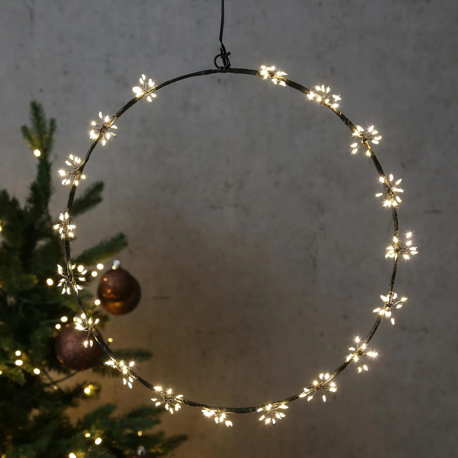 Wunderschöner 30cm großer Kranz aus feinem, schwarzen Draht, der mit 180 warmweißen LED bestückt ist. Der Kranz eignet sich sowohl als Fensterschmuck, Türschmuck oder für die Wand. Du kannst ihn ebenso als dekorativen Tischkranz (zum Beispiel um eine schöne Glasschale herum) einsetzen.