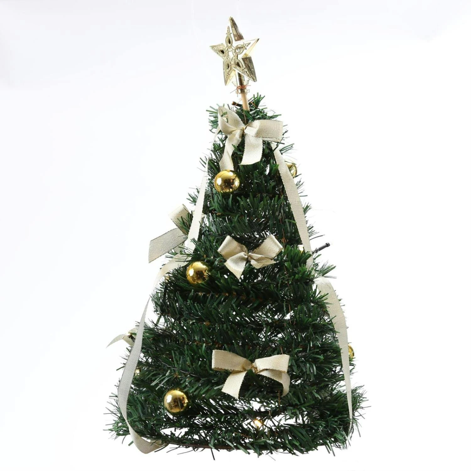 Der Weihnachtsbaum ist mit einer Lichterkette mit 10 warmweißen LED, goldenen Kugeln und goldenen Bändern geschmückt. Auf der Spitze thront ein goldener Stern.