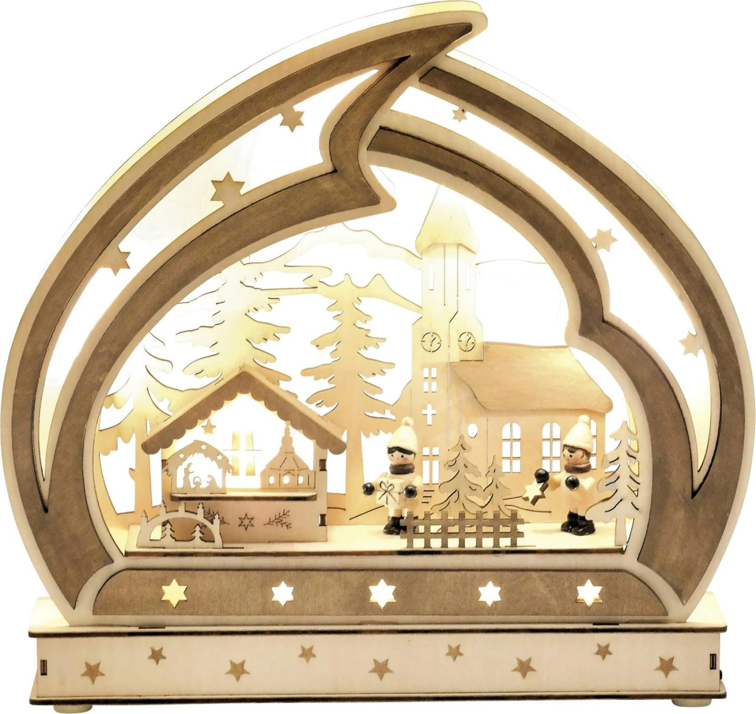 Das beleuchtete Weihnachtsdorf besteht aus einer Kirche, einem Rathaus, einer Schule und einem Wohnhaus. Dazu gibt es noch eine beleuchtete Laterne, Tannenbäume, den Schneemann mit seiner Freundin und natürlich den Weihnachtsmann mit seinem prall gefüllten Geschenkesack.