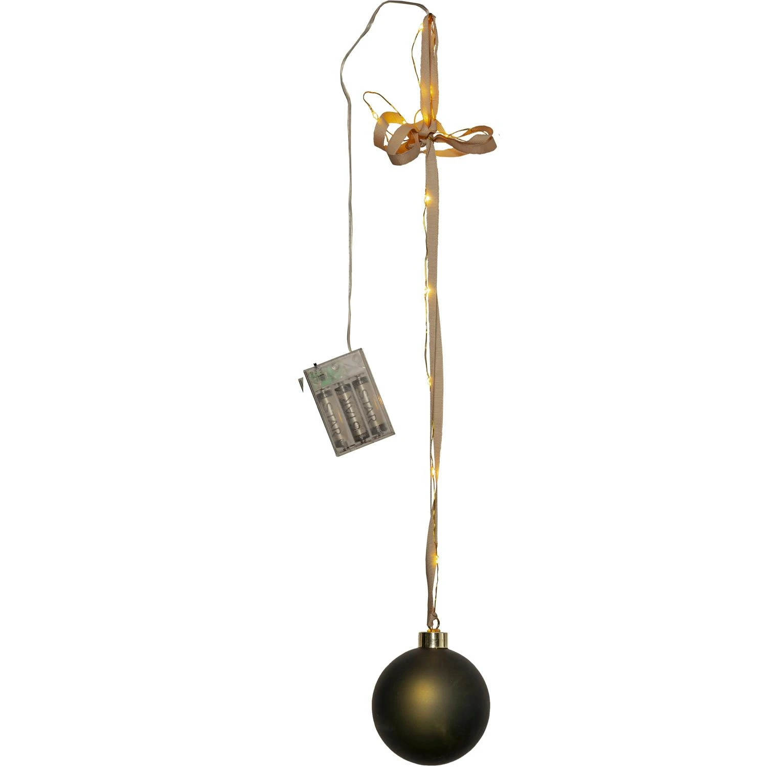 Die grünfarbene matte Kugel leuchtet im Inneren mit 3 warmweißen LED und präsentiert sich an einem schönen Dekoband, an dem eine Drahtlichterkette mit 13 warmweißen LED leuchtet. Die LED Weihnachtskugel wird mit Batterien betrieben. So kannst Du die Christbaumkugel überall im Innenbereich ohne Strom und lästiges Kabel einsetzen.