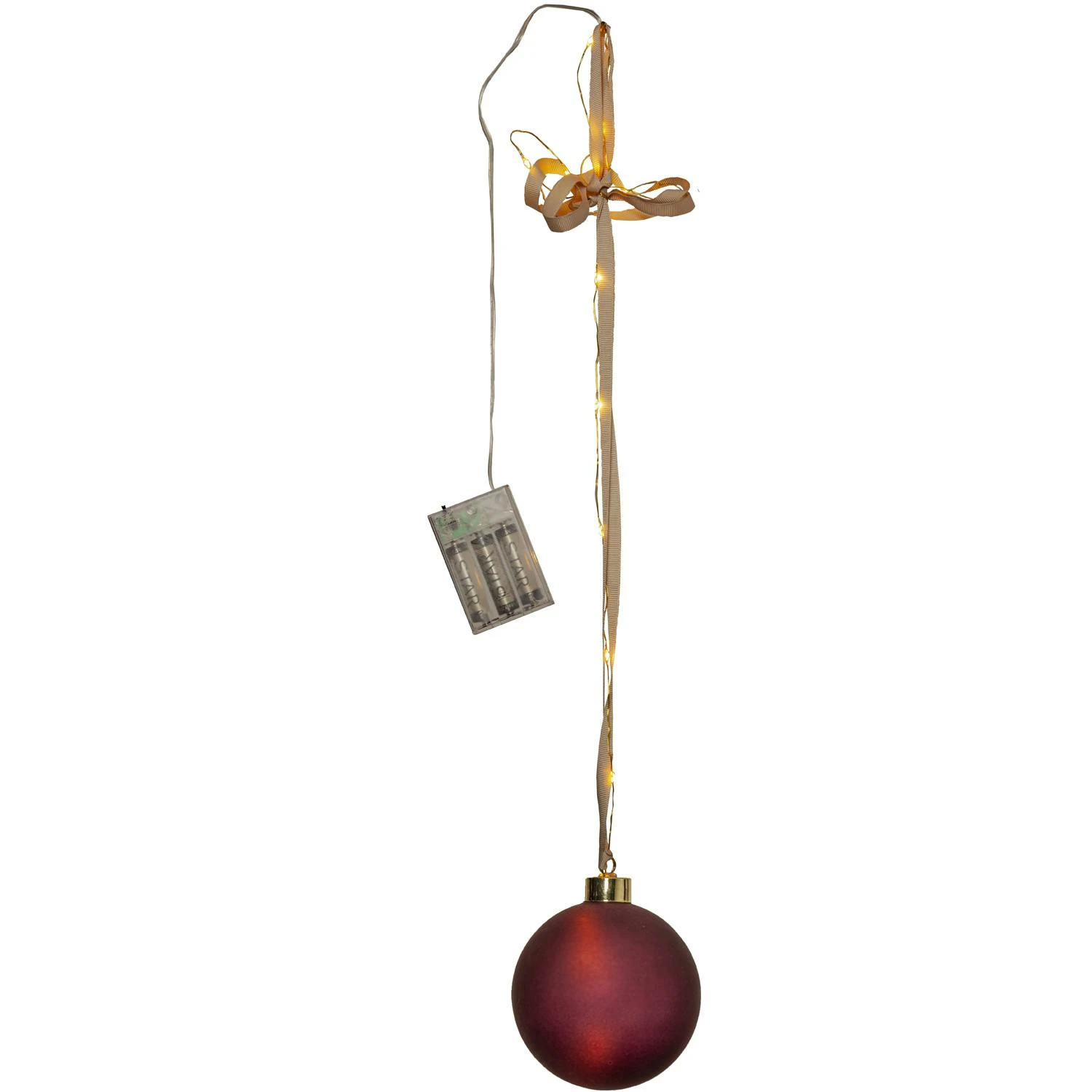 Die rotfarbene matte Kugel leuchtet im Inneren mit 3 warmweißen LED und präsentiert sich an einem schönen Dekoband, an dem eine Drahtlichterkette mit 13 warmweißen LED leuchtet. Die LED Weihnachtskugel wird mit Batterien betrieben. So kannst Du die Christbaumkugel überall im Innenbereich ohne Strom und lästiges Kabel einsetzen.