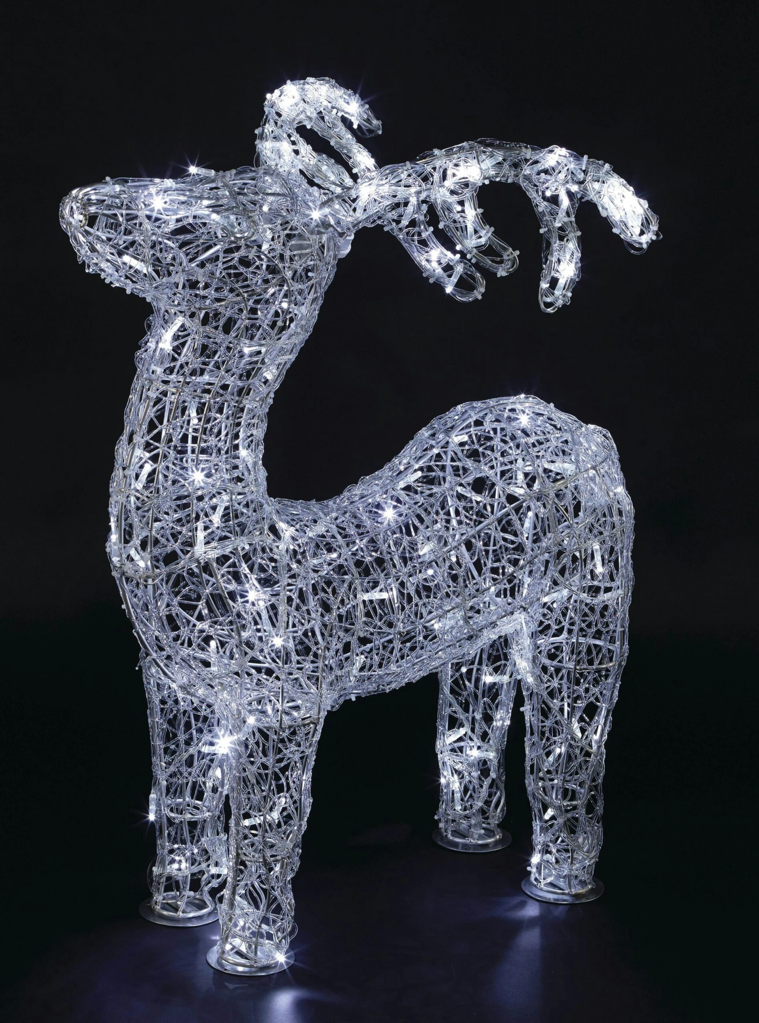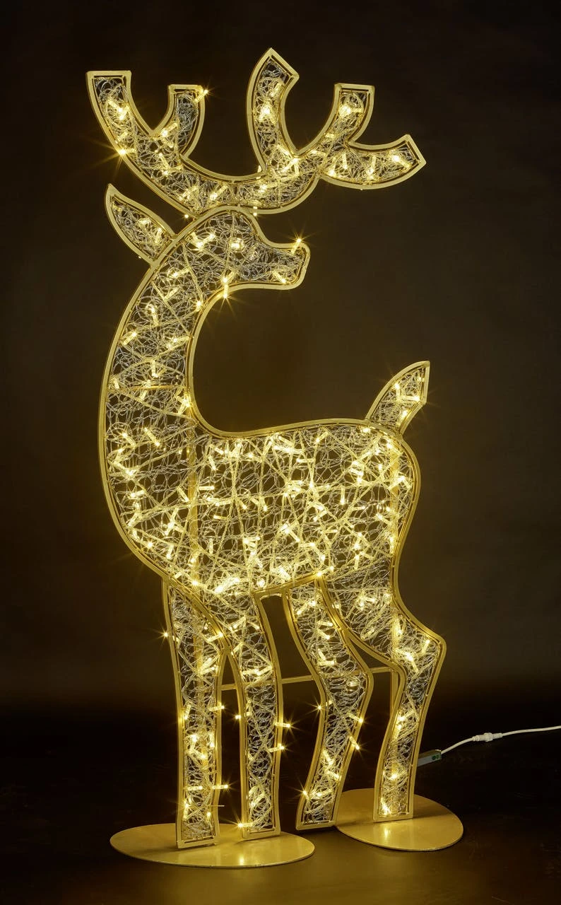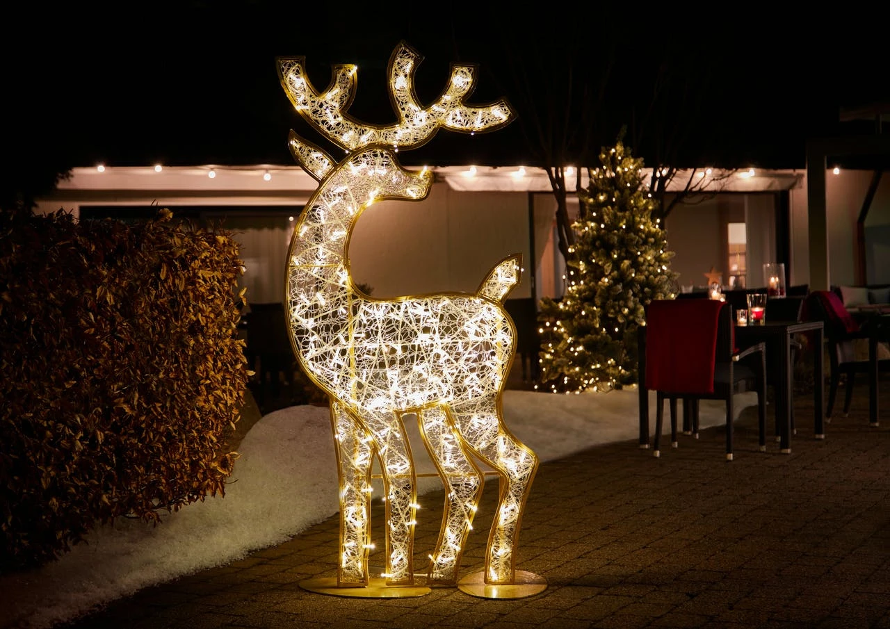 Das LED-Rentier von METRO Professional ist aus goldfarbenem, korrosionsbeständigem und leichtem, aber sehr stabilem Aluminium gefertigt. Das Produkt hat die Maße: 80 x 50 x 180 cm (B x T x H) und verfügt über 206 warmweiße LEDs mit festem Licht. Das Rentier verfügt über ein 10 m langes Stromkabel und ist für den Außeneinsatz geeignet.