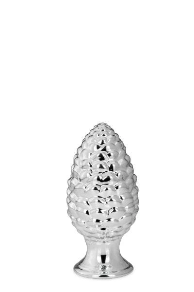 Pinienzapfen Dekoration, klein. Porzellan galvansiert silberglänzend. Größe 8,5 x 6,5 cm.