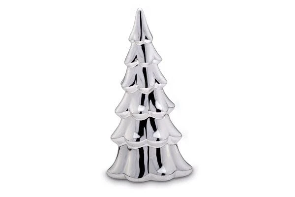 Tannenbaum Dekoration, mittel, Porzellan galvansiert silberglänzend. Größe 12,5 x 9,5 cm, Höhe 25 cm.