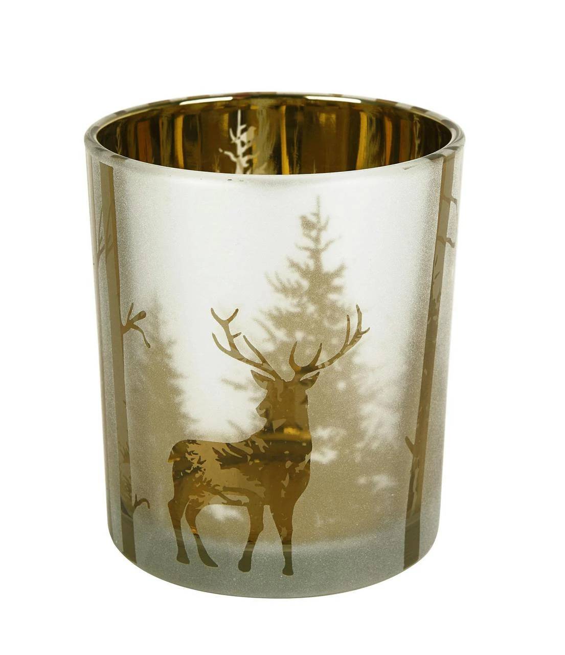 Der goldene Glas-Kerzenhalter mit Rentier und Weihnachtsbaum Muster von Tarrington House schafft eine festliche Atmosphäre und fügt sich perfekt in jede Einrichtung und jeden Ort ein. Er ist ausschließlich für den Innenbereich bestimmt und misst 8 x 8 x 10 cm (B x T x H).