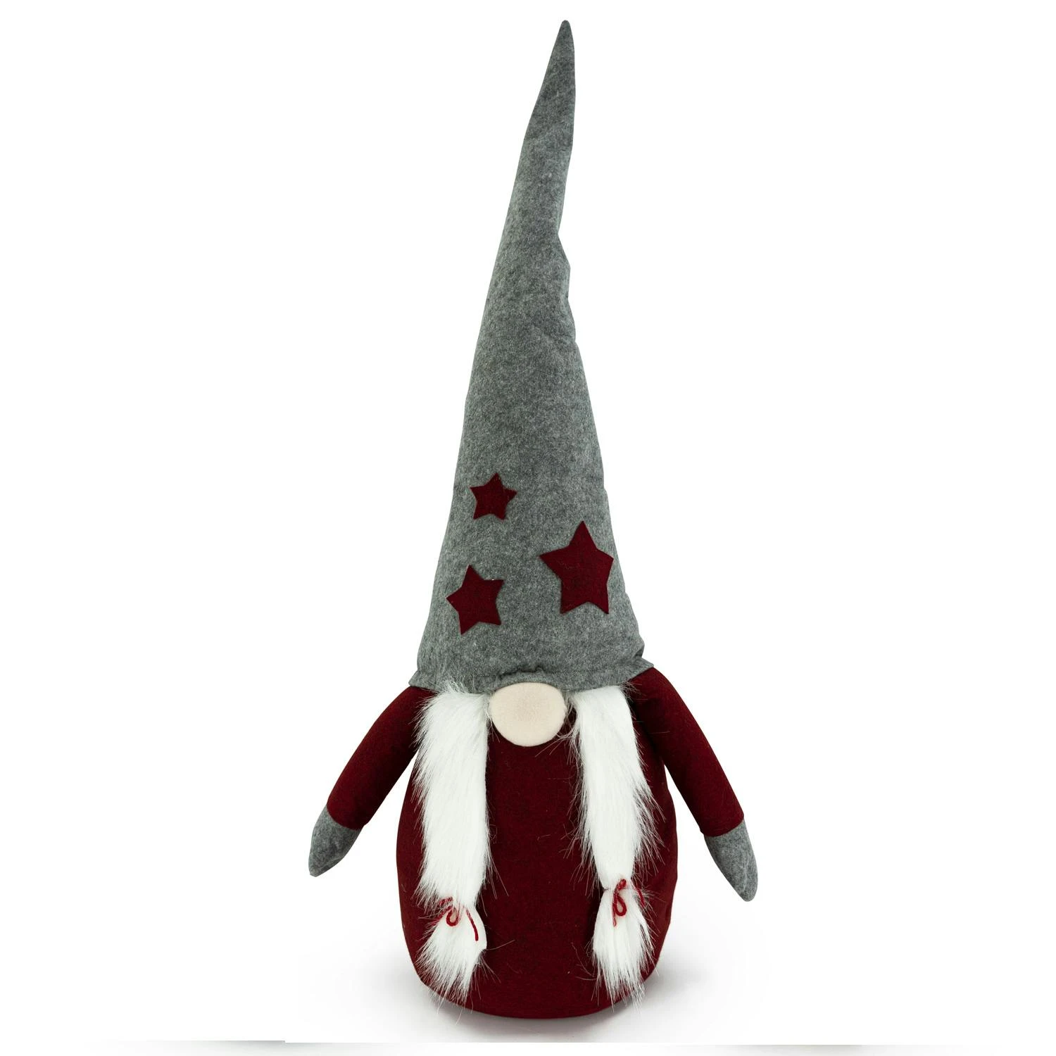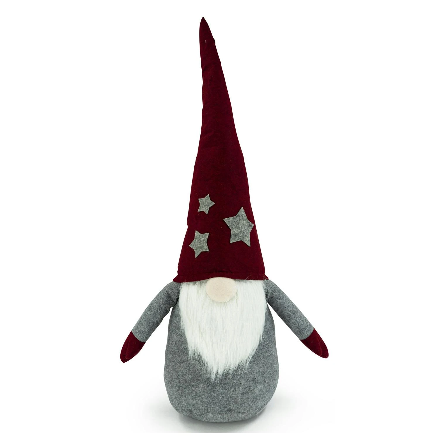 Wichtel ALVA – mit Zöpfen – Dekofigur – Filz – H: 1m – graue biegbare Mütze – weinrote Sterne